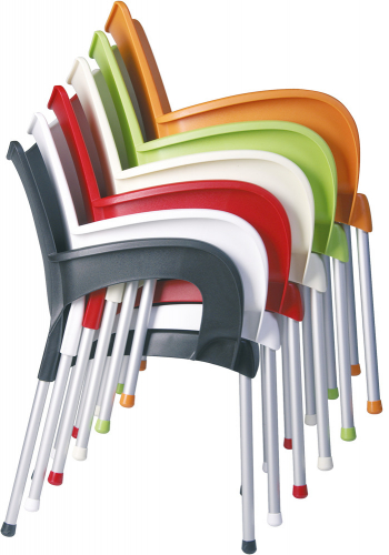 Пластиковое кресло Romeo с корпусом из перерабатываемого полипропилена и ножками из анодированного алюминия.