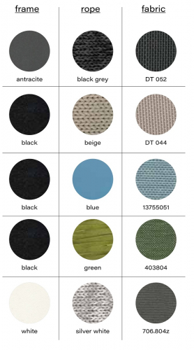 Варианты отделки каркаса/роупа/подушки: антрацит/черно-серый/DT 052, черный/бежевый/DT 044, черный/голубой/13755051, черный/зеленый/403804, белый/серебристо-белый/706.804z.