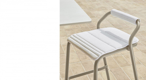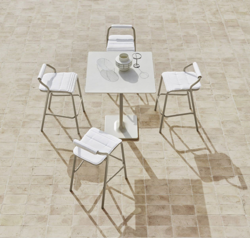 Барный стул Noss, идеально подходящий для барной зоны на открытом воздухе в офисе или в частном интерьере, может быть оснащен дополнительными подушками для сиденья и спинки.