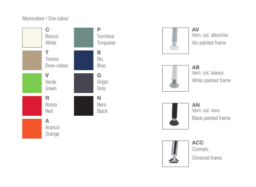 Варианты каркаса: окрашенный черный (AN), окрашенный белый (AB), окрашенный алюминий (AV), хромированный (ACC).