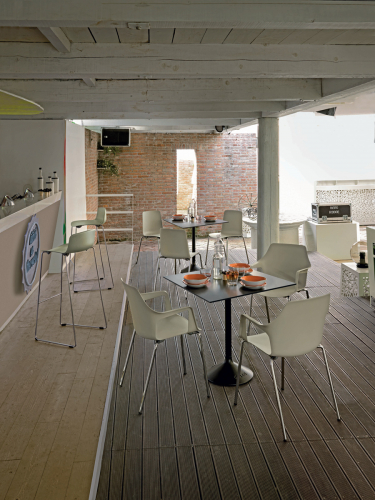 Барный стул Vesper 3 дополняет коллекцию Vesper. Он имеет тот же корпус, но более низкую спинку. Стальное основание имеет две высоты - 65 и 75 см: версии из белого и черного металла также подходят для наружного использования, в то время как хромированная рама предназначена только для внутреннего использования.