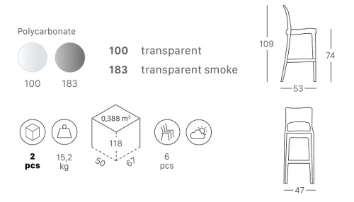 Информация по уходу: прозрачные стулья можно протирать тряпкой из микрофибры, допускается применение нейтрального мыльного раствора. Запрещается использовать спиртосодержащие или ацетоносодержащие (а также им подобные) средства.