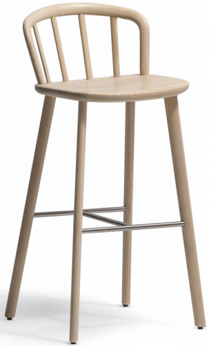 Барный стул Nym гармонично вписывается в коллекцию, напоминающую классические формы, оставаясь верным своей натуре и с легкостью парируя между традициями и инновациями. Изогнутый профиль спинки создает собой арку, которая плавно перетекает в сиденье из массива ясеня. Функциональность деревянного сиденья сочетается с каркасом из ясеня и подножкой из стали.