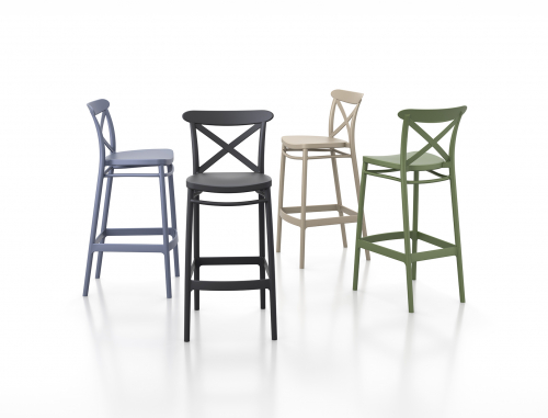 Барный стул Cross изготавливается из полипропилена, упрочненного стекловолокном, полученным с использованием новейшего поколения технологий формования пластмасс под давлением.