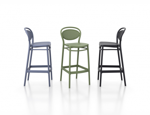 Барный стул Marcel изготавливается из полипропилена, упрочненного стекловолокном, полученным с использованием новейшего поколения технологий формования пластмасс под давлением.