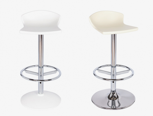 Барные стулья имеют выбор оснований: хромированный металл; или металл, впрыскиваемый одновременно с технополимером, в том же цвете, что и корпус. Корпус у обеих моделей выполнен из технополимера в двух классических оттенках.