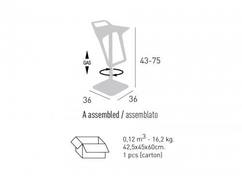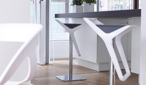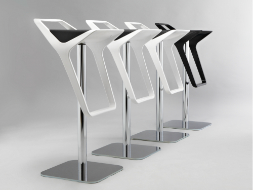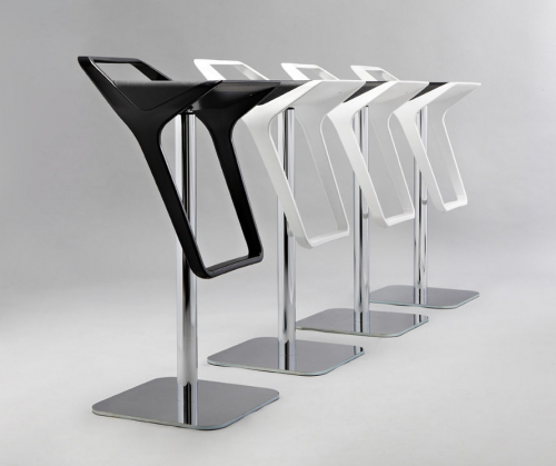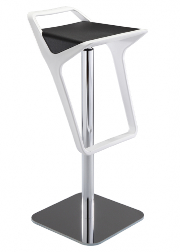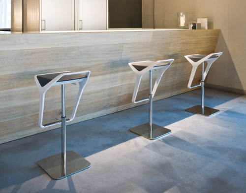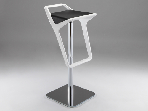Корпус барного стула выполнен из технополимера и представлен в различных цветовых сочетаниях спинки/подножки и сиденья. Коллекция включает в себя две модели, одна из который имеет только поворотное сиденье, вторая - дополнительную регулировку по высоте.