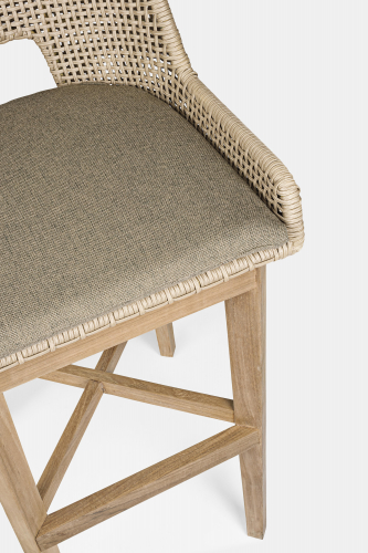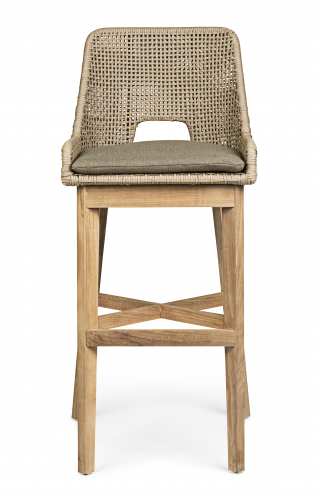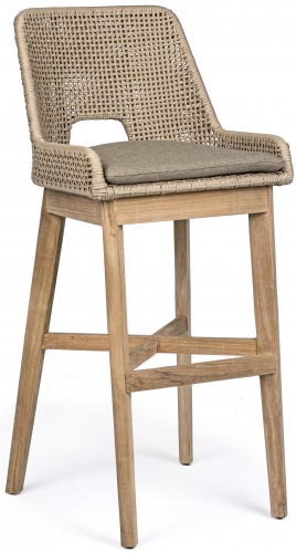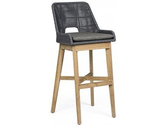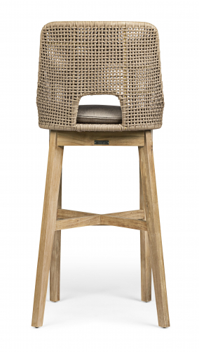 Плетеный барный стул Hesperia выполнен из переплетения канатов из олефина (100% полипропилен). Каркас выполнен из алюминия с порошковой покраской (полиэстер), разборные ножки - из тика SVLK (легальное индонезийское дерево), саморезы из оцинкованной стали. Подушка на сиденье со съемным чехлом из солнцезащитной олефиновой ткани (100% полипропилен).