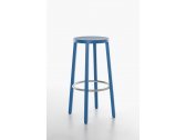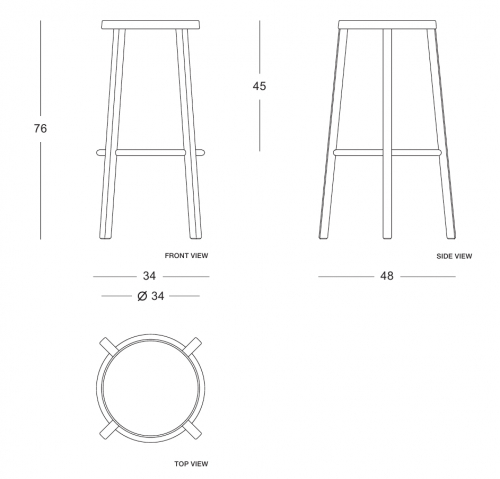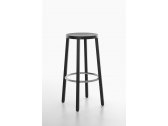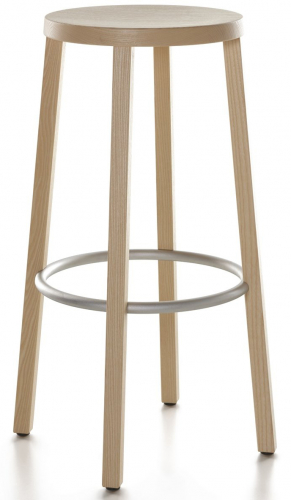 Кольцо для опоры для ног выполнено из металла, чтобы оттенить и подчеркнуть деревянную структуру табурета.