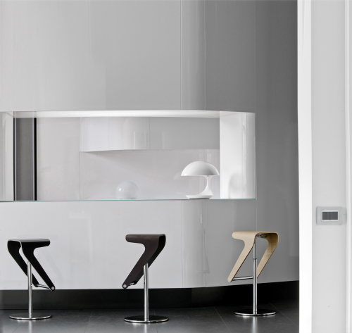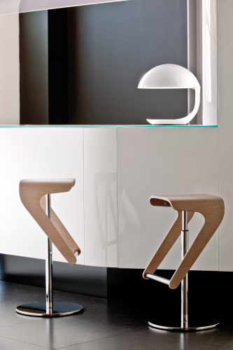 Табурет-трансформер Woody представлен в самых разнообразных вариантах отделки, поэтому прекрасно впишется в частные и коммерческие интерьеры. Удобная форма этой модели от сиденья до стальной трубы, которая выполняет функцию подножки, регулируется по высоте, благодаря чему подойдет для столов и стоек различной высоты.