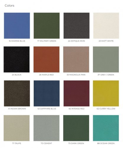Материал: окрашенная сталь. Состав: железо и углеродный сплав с содержанием углерода менее 2%, обработанные, чтобы выдерживать воздействия окружающей среды, с помощью уникально антикоррозионной обработки EMU-Coat.