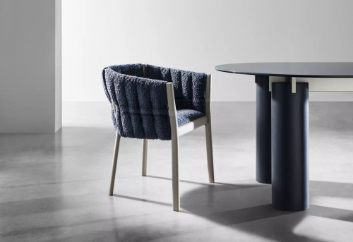 Yelek – это турецкое название жилета. Эта коллекция кресел вдохновлена сшитым на заказ жилетом. Придерживаясь той же философии внимания к деталям, что и в мире высокой моды, Yelek отличается встроенной в конструкцию кулисой, которая незаметно проявляется на спинке в форме ракушки, опоясывающей сиденье. Универсальное и изысканное решение для обеденной зоны, оно задумано как "одетое" с помощью обивки, которая, напоминая эффект пуховика, обволакивает деревянный каркас, позволяя время от времени увидеть его структуру.