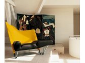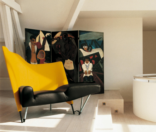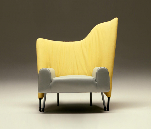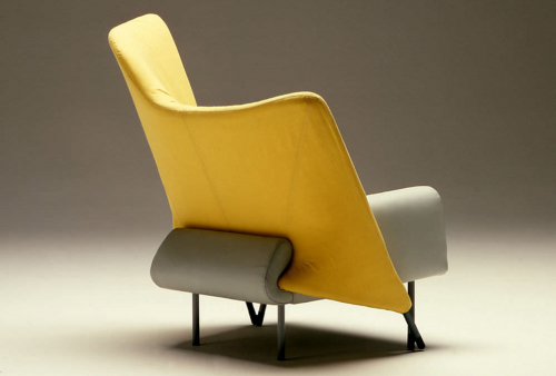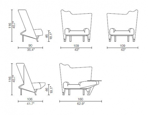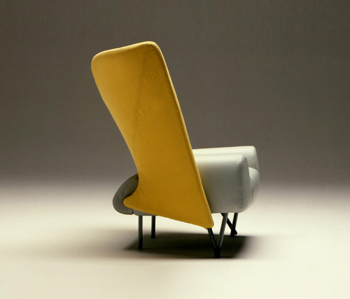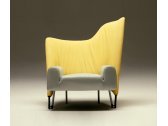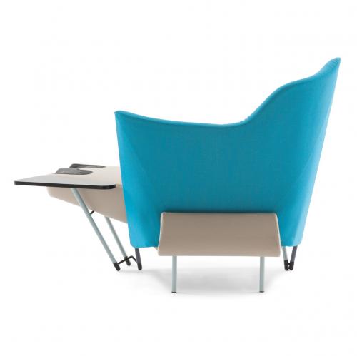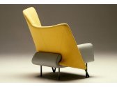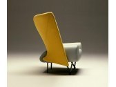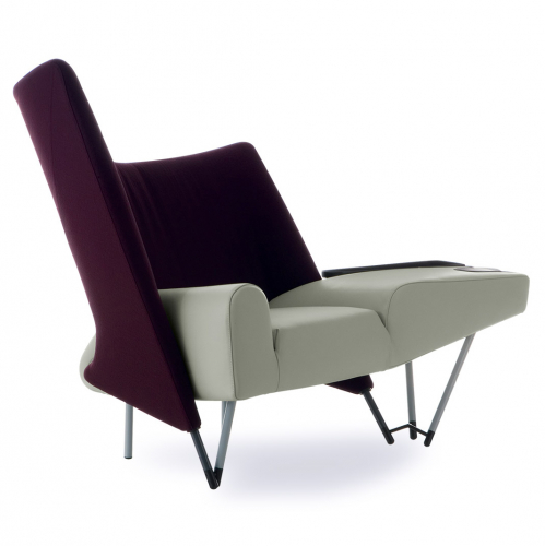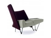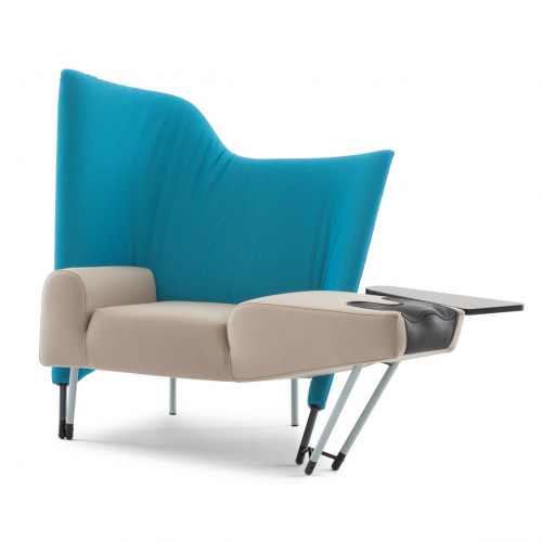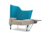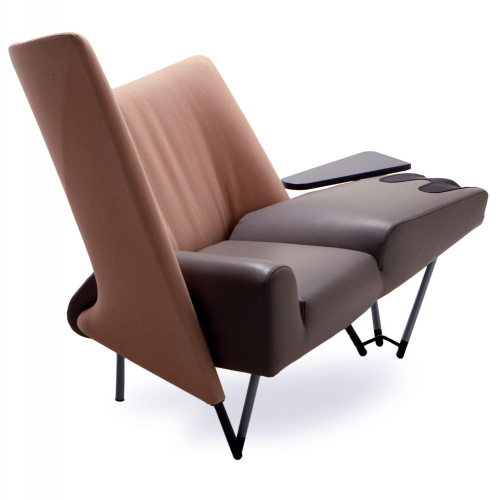 Сиденье и спинка могут быть обиты другим материалом и цветом. Кресло с подставкой для ног снабжено треугольной столешницей из лакированного дерева цвета: серый, черный, охра.