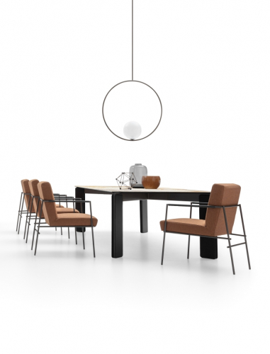 Кресло Kyo – современная модель в минималистичном стиле, созданная мастерами итальянской фабрики DITRE с использованием материалов исключительного качества. Эффектный контраст тонкого, но прочного основания и мягкой массивной раковины сиденья – отличительная особенность Kyo, выгодно выделяющая его в бесконечной череде кресел. Геометричные ножки и подлокотники полностью изготовлены из металла, покрытого матовой краской насыщенного цвета. Внутреннее наполнение мягкого сиденья и спинки – пенополиуретан. В качестве внешней отделки используется ткань различных оттенков из собственного богатого ассортимента фабрики. Высота и размер кресла были разработаны, чтобы сделать его идеальным для изысканных и сдержанных обеденных столов. Прекрасный вариант для оформления домашней обеденной зоны, офисной переговорной или общественного пространства.