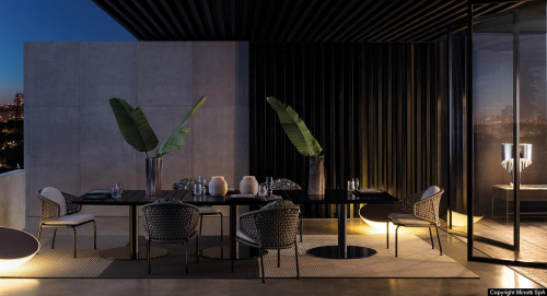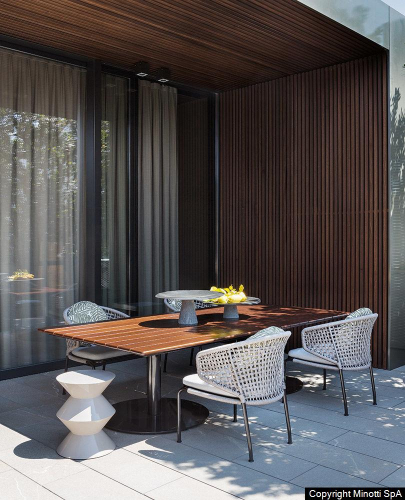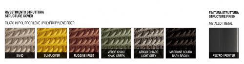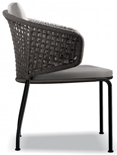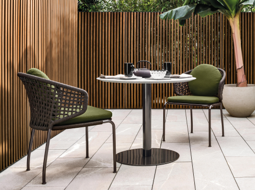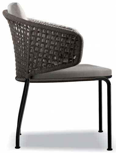 Коллекция Aston Cord Outdoor поставляется с металлическим каркасом цвета олово, специально обработанным для наружного использования, как и мягкие подушки, покрытые водонепроницаемой тканью. Спинка сиденья изготовлена из специального плетеного полипропиленового каната диаметром 7 мм, доступного в разных цветовых вариантах. Сиденья имеют эксклюзивный геометрический дизайн Minotti Studio, вырезанный лазером.