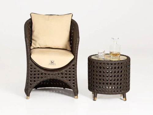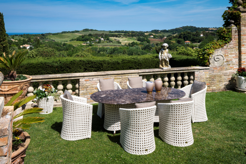 Мебель из синтетического волокна VIRO® ручной работы, разработанная для длительного использования на открытом воздухе и, следовательно, устойчивая к любым атмосферным воздействиям. Обладает устойчивостью к перепадам температур (от -70°C до +80°C), ультрафиолетовым лучам, не теряет цвет, влагостойкостью, устойчивость к соли и хлору, плесени. Это нетоксичный экологичный материал (на 100% перерабатываемый), по ощущению как натуральный материал. Корпус мебели реализуют из крашеного алюминия, покрытого плетением из специального синтетического волокна того же цвета. Чехлы подушек выполнены из уличных тканей - дышащих, водоотталкивающих, устойчивых к плесени, они не обесцвечиваются и устойчивы к УФ-лучам. Кроме того, их можно стирать в стиральной машине при 30 °C, и они просты в уходе. Чехлы подушек могут быть выполнены из тканей категорий C, D, E, F, G, S, а также из собственной ткани клиента. Посмотреть палитру материалов Samuele Mazza.
