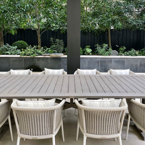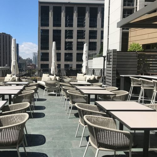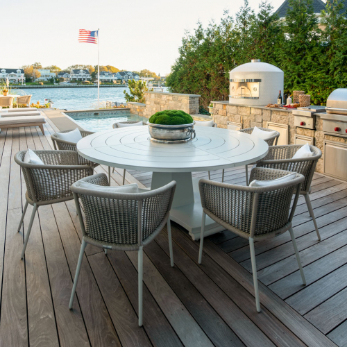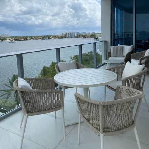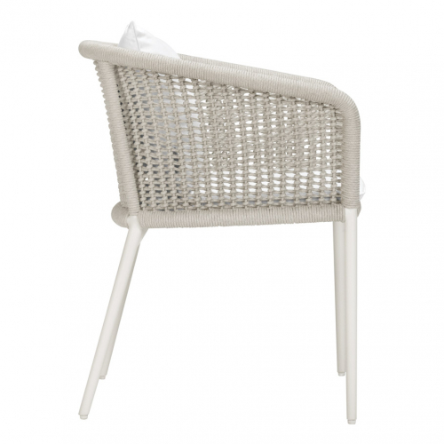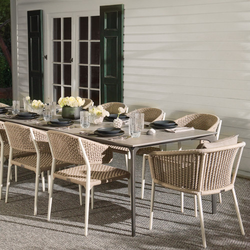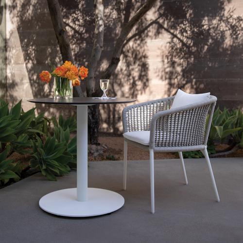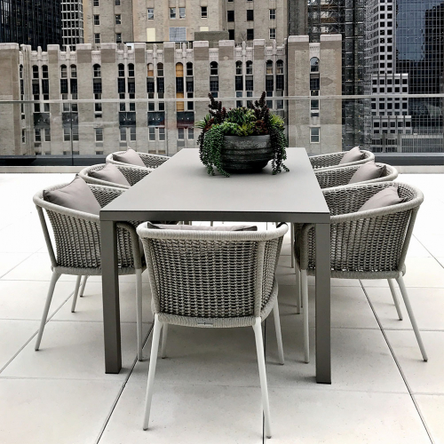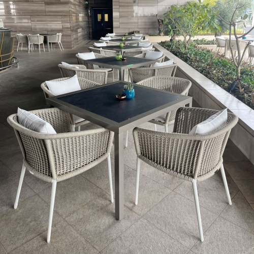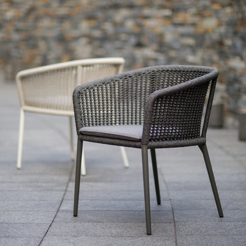 Knot - это коллекция для обеденной и гостиной зоны, которая отличается красивыми плетеными элементами ручной работы, поддерживаемыми легкой алюминиевой рамой. Используя технику макраме модифицированного рифового узла, этот ансамбль необычного дизайна настолько же прочен, насколько и превосходен.