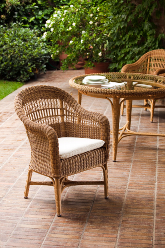 Кресло и столы доступны в двух оттенках, они вызывают в воображении идею гибкости с потрясающей силой их плетения ручной работы.
