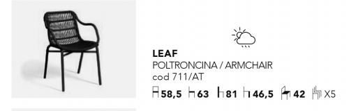 Новая коллекция Leaf ценится за свою элегантность и легкость. Коллекция имеет прочный алюминиевый каркас, обтянутый синтетическим канатом (роупом) ручной работы. Кресла идеально подходят для создания обеденной зоны на открытом пространстве.