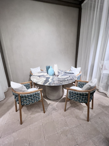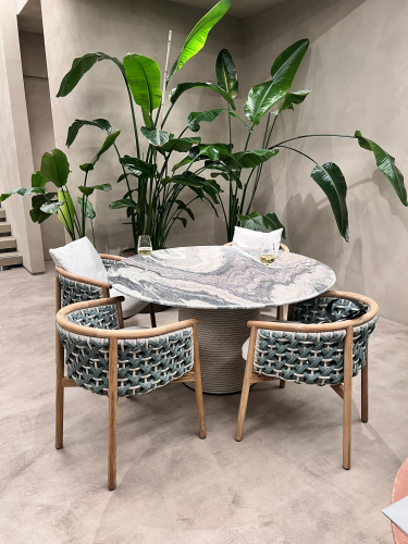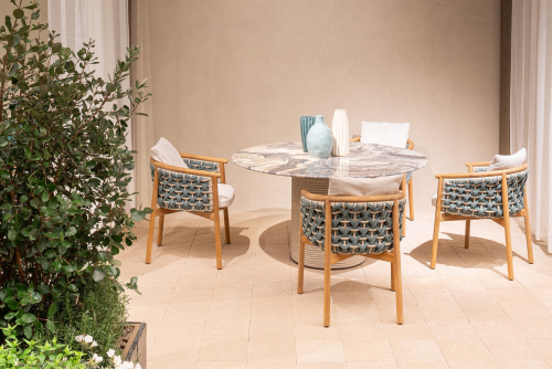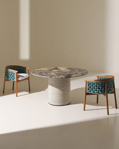 Коллекция Patio фабрики Ethimo была представлена на выставке Salone del Mobile в Милане 2024. Она отличается творческим использованием плетения в сочетании с естественной красотой тика. Мебель Patio предназначена для гостиных, столовых, открытых дворов с бассейном и фонтанами, украшающими сад. Название и особое арочное плетение напоминают традиционные внутренние патио, столь типичные для испанской архитектуры, где портики и лоджии были чуть ли не самыми важными частями в доме.