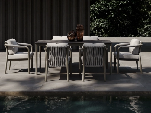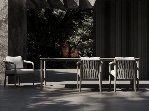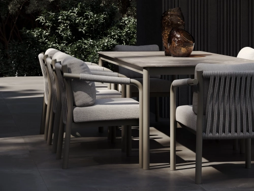 Коллекция включает в себя кресло, двухместный и трехместный диваны, журнальный столик, шезлонг и кушетку, образуя полноценный комплект мебели для отдыха на открытом воздухе, выдержанный в едином стиле. Обеденный гарнитур продолжает эту концепцию благодаря тому же структурированному алюминиевому каркасу, обеспечивая визуальную гармонию всех типов мебели.