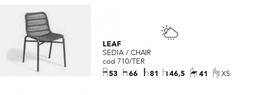 Новая коллекция Leaf ценится за свою элегантность и легкость. Коллекция имеет прочный алюминиевый каркас, обтянутый синтетическим канатом (роупом) ручной работы. Стулья идеально подходят для создания обеденной зоны на открытом пространстве.