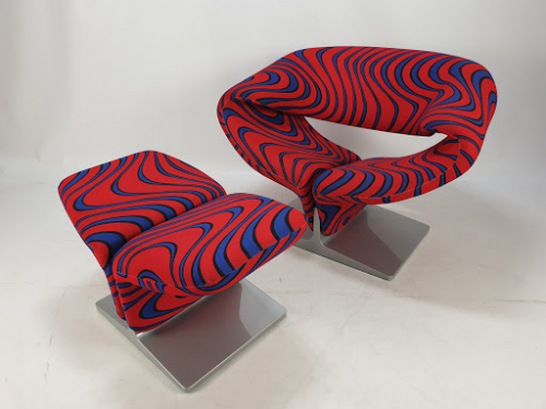Прекрасный образец прикладного искусства. Ribbon - это кресло с мягкой обивкой, созданное Pierre Paulin в 1966 году, как его профессиональное, новаторское видение хорошо известной формы ленты. Легендарный дизайн. Металлический каркас с горизонтальными пружинами, покрытый поролоном и эластичной тканью. Пьедестал из лакированной прессованной древесины. Кресло представлено в коллекции Национальной галереи Виктории в Мельбурне, Австралия.