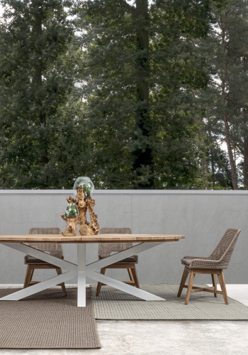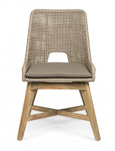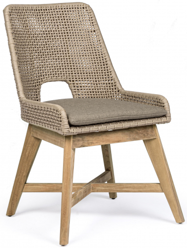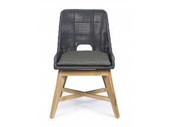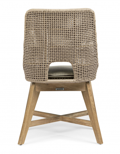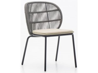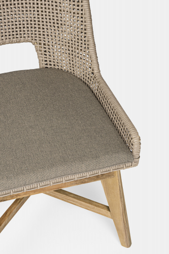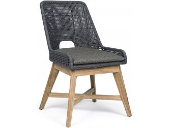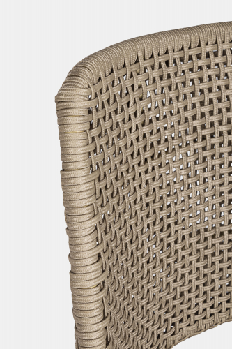 Плетеный стул Hesperia выполнен из переплетения канатов из олефина (100% полипропилен). Каркас выполнен из алюминия с порошковой покраской (полиэстер), разборные ножки - из тика SVLK (легальное индонезийское дерево), саморезы из оцинкованной стали. Подушка на сиденье со съемным чехлом из солнцезащитной олефиновой ткани (100% полипропилен).