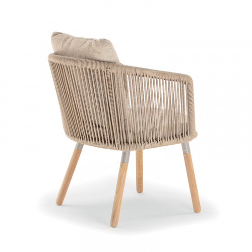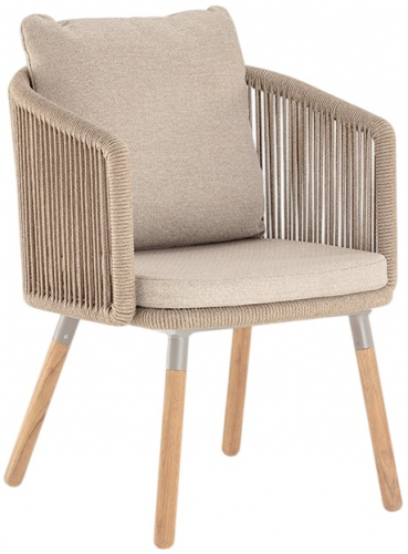 Уличное кресло Bahamas выполнено из окрашенного алюминия с красивым плетением роупа из полиэстера и ножками из тика. На сиденье и спинке подушки из акрила со съемными чехлами.