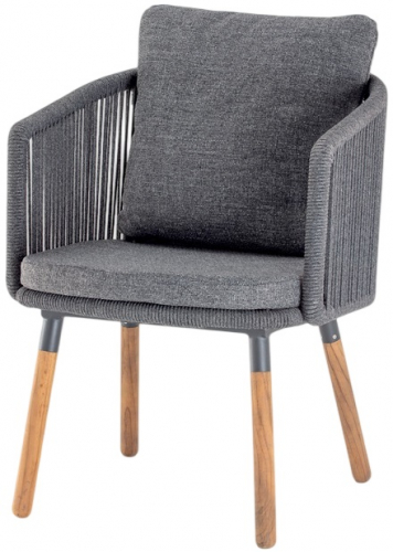 Уличное кресло Bahamas выполнено из окрашенного алюминия с красивым плетением роупа из полиэстера и ножками из тика. На сиденье и спинке подушки из олефина со съемными чехлами.