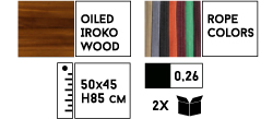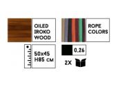 Стул выполнен из дерева ироко, обработанного маслом, в сочетании с плетением из каната fender (100% полипропилен) диаметром 8 мм. Варианты цвета каната представлены в палитре. Ироко - крепкая древесина, которая имеет большой срок эксплуатации, а полипропилен - чрезвычайно прочный и приятный на ощупь материал, устойчивый к ультрафиолетовым лучам и плохой погоде. Использование качественных материалов гарантирует удобство во время сидения и эстетическую ценность для окружающего пространства.