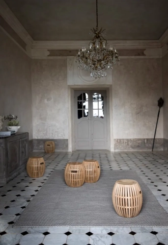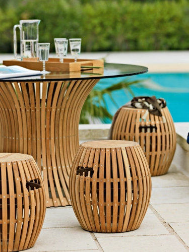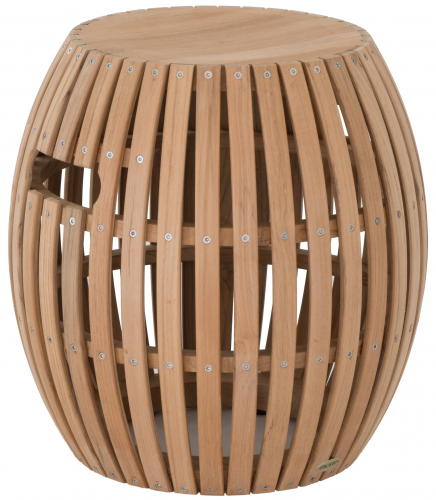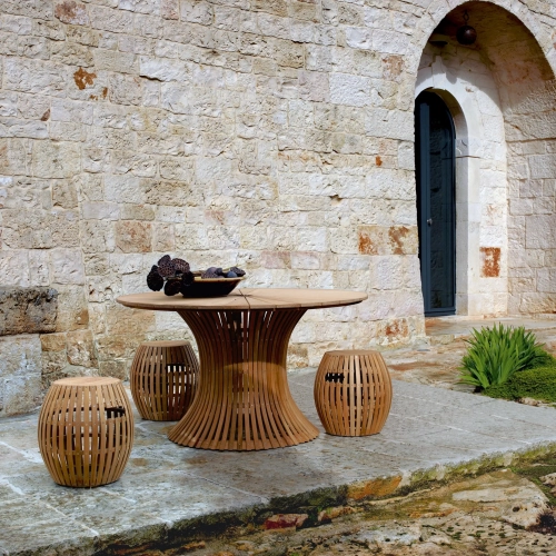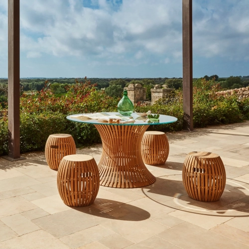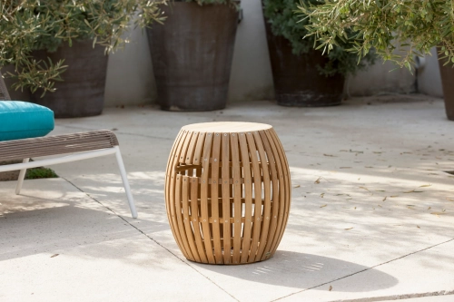 Изогнутые под действием тепла планки придают изделиям коллекции Swing извилистый вид и особую эргономичность, таким как лежак и практичные многофункциональные столики-табуреты.