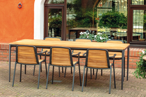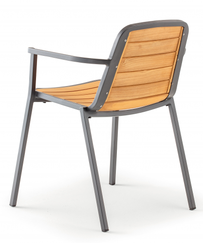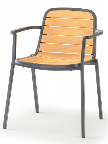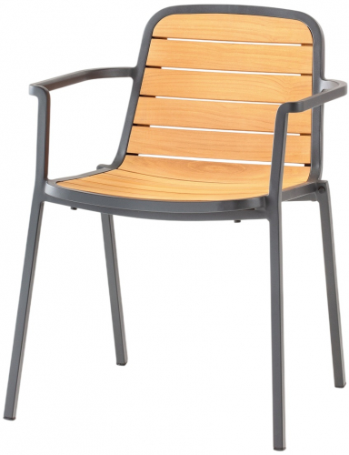 Уличное кресло Nida имеет алюминиевый окрашенный каркас с сиденьем и спинкой из планок тикового дерева. Прочное и стильное кресло подойдет для обустройства обеденных зон на открытых пространствах частного или общественного назначения.