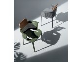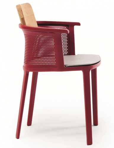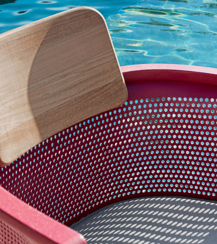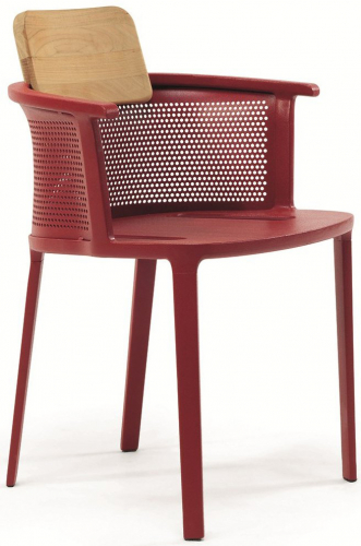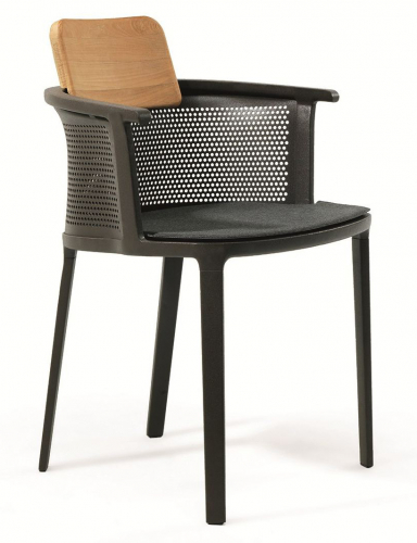 Кресло Nicolette с узнаваемой охватывающей формой отличается интересным сочеатнием материалов и цветов: каркас из литого алюминия с шестью различными вариантами отделки (Warmwhite, Olive Green, Coffee, Warmgrey, Sepia Black, Warmred), задняя часть с необычным микроперфорированным рисунком,и спинкой из натурального тика, также для заказа доступна мягкая вставка со специальной плиссированной структурой