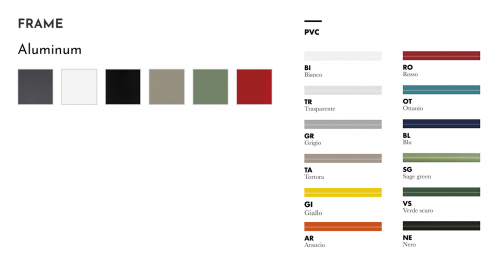 Варианты отделки: капучино (CA), зеленый шалфей (SG), белый (BS), антрацит (AN), черный (NE), красный (RO).