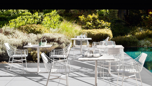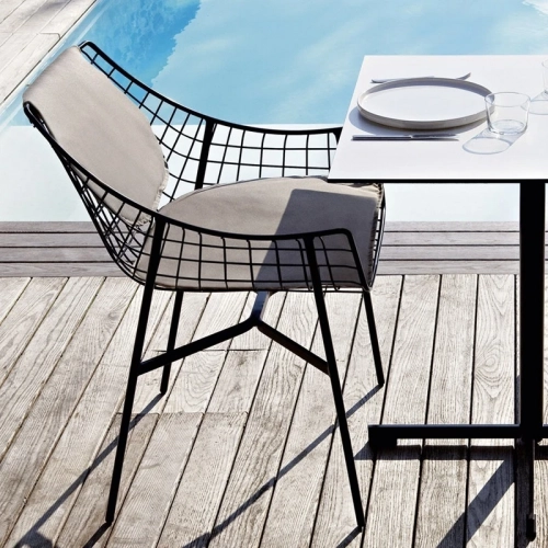 Дизайн обеденного кресла Summer Set отличается приветливой, изящно изогнутой формой. Каркас, выполненный из металлической сетки, задает графичный ритм, который может элегантно подхватываться мягкими подушками. Благодаря своему свежему и динамичному силуэту, это кресло станет идеальным выбором для модного заведения или ресторана с видом на море, даря своим гостям моменты истинного релакса.