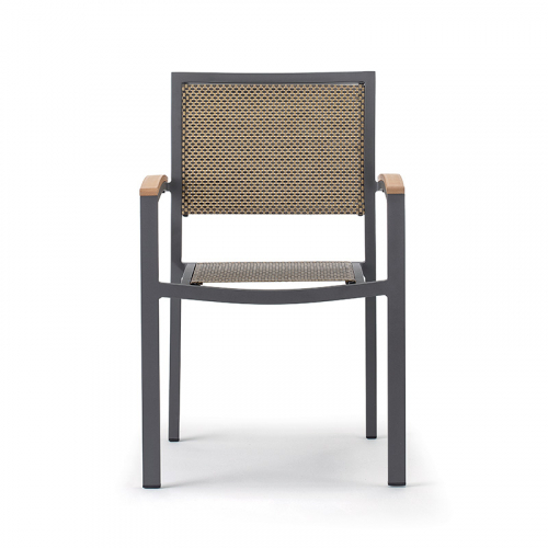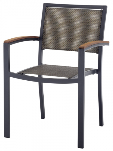 Удобное и практичное садовое кресло GS 939 с алюминиевым каркасом, сиденьем и спинкой из текстилена и подлокотниками, украшенными вставками из техно-дерева. Устойчивое к атмосферным воздействиям, это кресло подходит для террас и приусадебных участков, а также для баров, кафе, торговых центров.