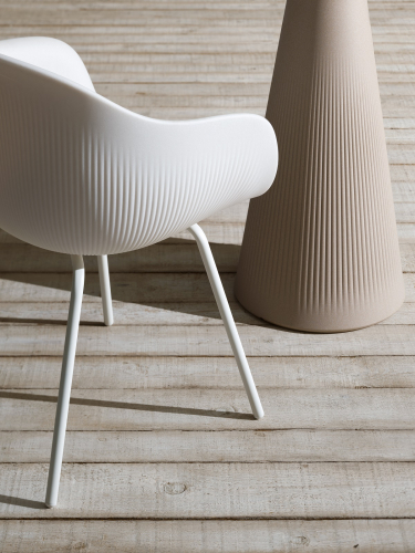 Благодаря технологии ротационного формования кресло Fade сочетает в себе комфорт с прочностью сиденья, придавая ему скульптурный и изысканный внешний вид. Кресло имеет плавные линии и уникальную ребристую поверхность со специальной отделкой, напоминающей натуральные материалы. Ножки выполнены из окрашенного металла.