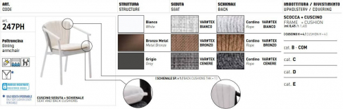 - Сиденье выполнено из VAR#TEX - это ткань из ПВХ-волокна, разработанная компанией Varaschin Spa для наружных изделий. Это полиэстеровое волокно, защищенное ПВХ-покрытием. Затем волокна соединяются вместе, чтобы получить особенно прочную нить. Материал долговечен, устойчив, эластичен, не рвется и не рвется. Наиболее важной особенностью VAR#TEX является эластичность, которая гарантирует максимальный комфорт при сидении. Ткани VAR#TEX устойчивы к плесени и пятнам, а также имеют стойкую к ультрафиолетовому излучению и загрязнению обработку поверхности.