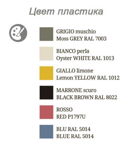 Возможные цвета корпуса: серый RAL 7003, синий RAL 5014, черный, коричневый RAL8022, жемчужный белый RAL 1013, красный Red P1797A , лимонный желтый RAL1012.