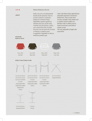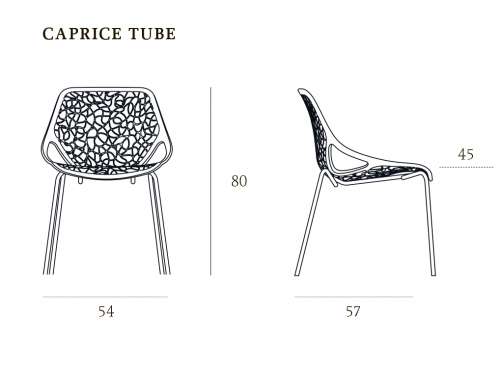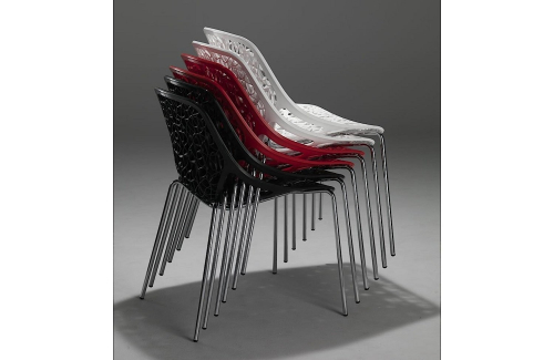 Коллекция стульев и кресел Caprice родилась из образа ленты, которая, свободно разворачиваясь в пространстве, создает своеобразное "трехмерное кружево", в котором пустые пространства явно преобладают над заполненными. Литье под давлением из полиамида, особенность и уникальность перфорированного корпуса потребовали сложных предварительных исследований для реализации инструмента с точки зрения изучения распределения длины волны, а также для анализа потока впрыска. Стул Casprini - это художественная красота, полная нюансов, которая оправдает даже самые изысканные ожидания.