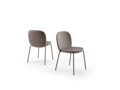 Стул имеет плавные линии и уникальную ребристую поверхность со специальной отделкой, напоминающей натуральные материалы. Ножки выполнены из окрашенного металла.