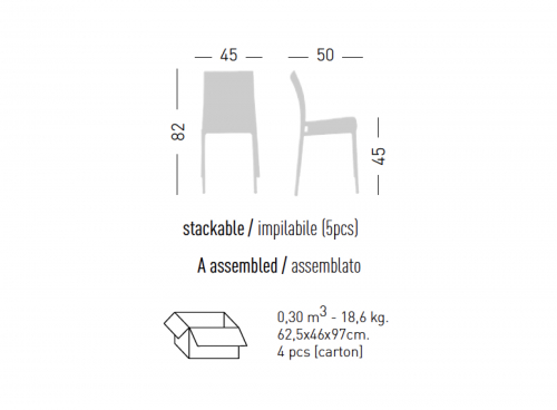 Высокая прочность, полученная благодаря одновременной инъекции металла и технополимера, обеспечивает длительный срок службы даже после интенсивного использования. Он может штабелироваться до 5 штук, имеет сертификат CATAS и подходит как для внутреннего, так и для наружного использования.