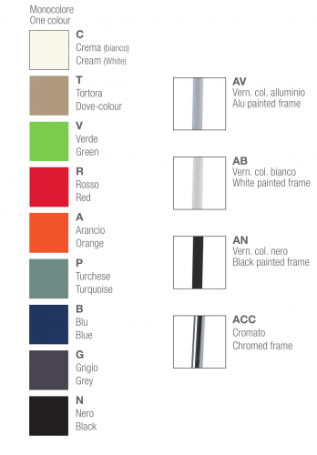 Варианты каркаса: окрашенный черный (AN), окрашенный белый (AB), окрашенный алюминий (AV), хромированный (ACC).