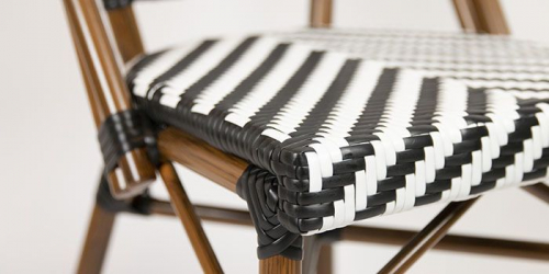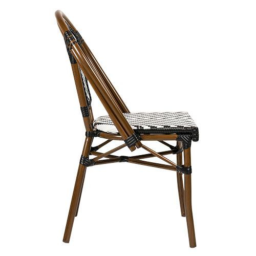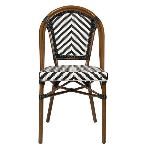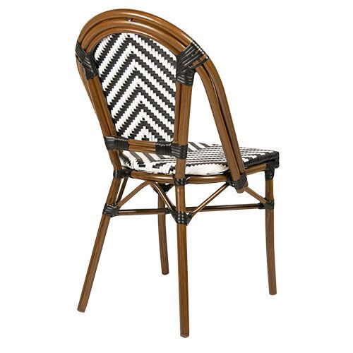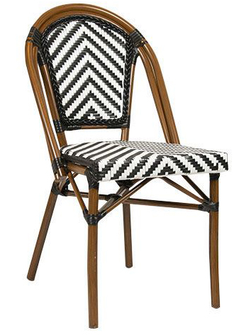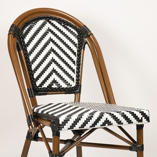 Удивительный, красочный и шикарный стул для летних площадок Toby I идеально вписывается в стиль "Café de Paris". Сочетание алюминиевого каркаса, имитирующего бамбук, и стойкого к УФ-излучению черно-белого полиэтиленового плетения 5 мм подчеркивает его игривый дизайн.