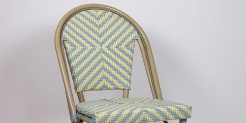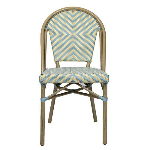 Удивительный, красочный и шикарный стул для летних площадок Toby II идеально вписывается в стиль "Café de Paris". Сочетание алюминиевого каркаса, имитирующего светлый бамбук, и стойкого к УФ-излучению бежево-голубого полиэтиленового плетения 5 мм подчеркивает его игривый дизайн.