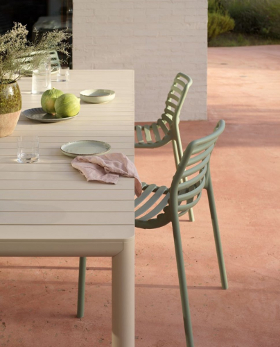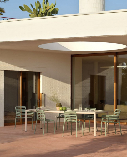 Свежая, легкая и эргономичная, Doga - это новая очаровательная коллекция уличной мебели: Кресла с подлокотниками и без них, кресло для отдыха и моноблочный журнальный столик из стеклопластика (полипропилен и стекловолокно). Вся коллекция была вдохновлена решетчатым дизайном, но Рафаэлло Галиотто, ее дизайнер, придал ей современный оттенок. Плавные линии спинки и сиденья стульев характеризуются игрой заполнений и пустот, отмеченных последовательностью горизонтальных планок.