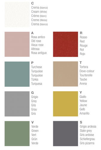 Варианты отделки: кремовый (С), розовый (A), бирюзовый (P), серый (G), зеленый (V), тортора (T), красный (R), желтый (Y), темно-серый (S).