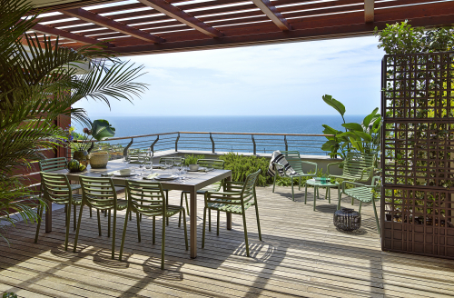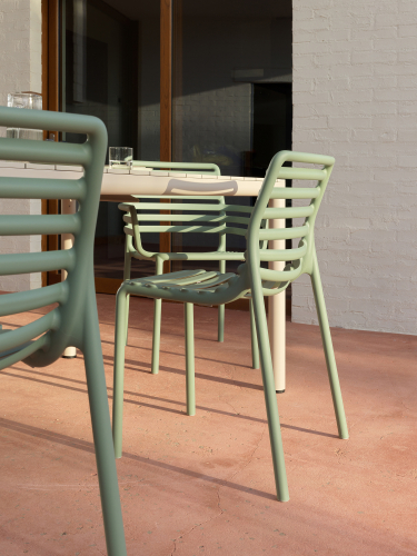 Кресло Doga станет отличным решением для обстановки обеденных зон или зон отдыха на свежем воздухе сферы Contract, но также оно отлично впишется в частные интерьеры. Эстетичная и функциональная модель максимально практична в использовании: с легкостью штабелируется, дезинфицируется и полностью перерабатывается.