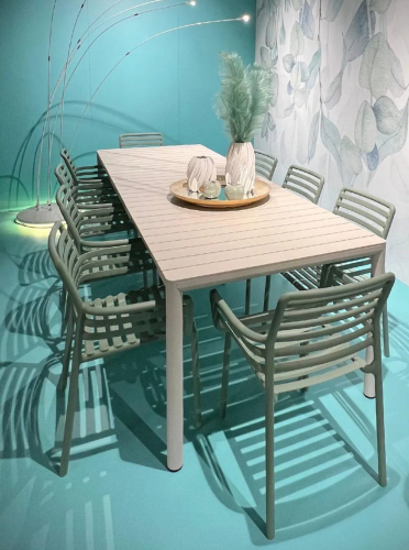 Свежая, легкая и эргономичная, Doga - это новая очаровательная коллекция уличной мебели: Кресла с подлокотниками и без них, кресло для отдыха и моноблочный журнальный столик из стеклопластика (полипропилен и стекловолокно). Вся коллекция была вдохновлена решетчатым дизайном, но Рафаэлло Галиотто, ее дизайнер, придал ей современный оттенок. Плавные линии спинки и сиденья стульев характеризуются игрой заполнений и пустот, отмеченных последовательностью горизонтальных планок.
